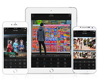 【パソコンから中央集中管理】 CMSソフトウェア(無料)を利用することで、最大128台のネットワークカメラ(最大64分割×2)を、ライブ監視・再生、その他、監視本部で各拠点を効率的に集中して管理することができます。例えば各拠点の支店や店舗に設置したネットワークカメラやNVRを、本社や管理部門で集中管理することが可能となります。 【CMS PCシステム要件】
