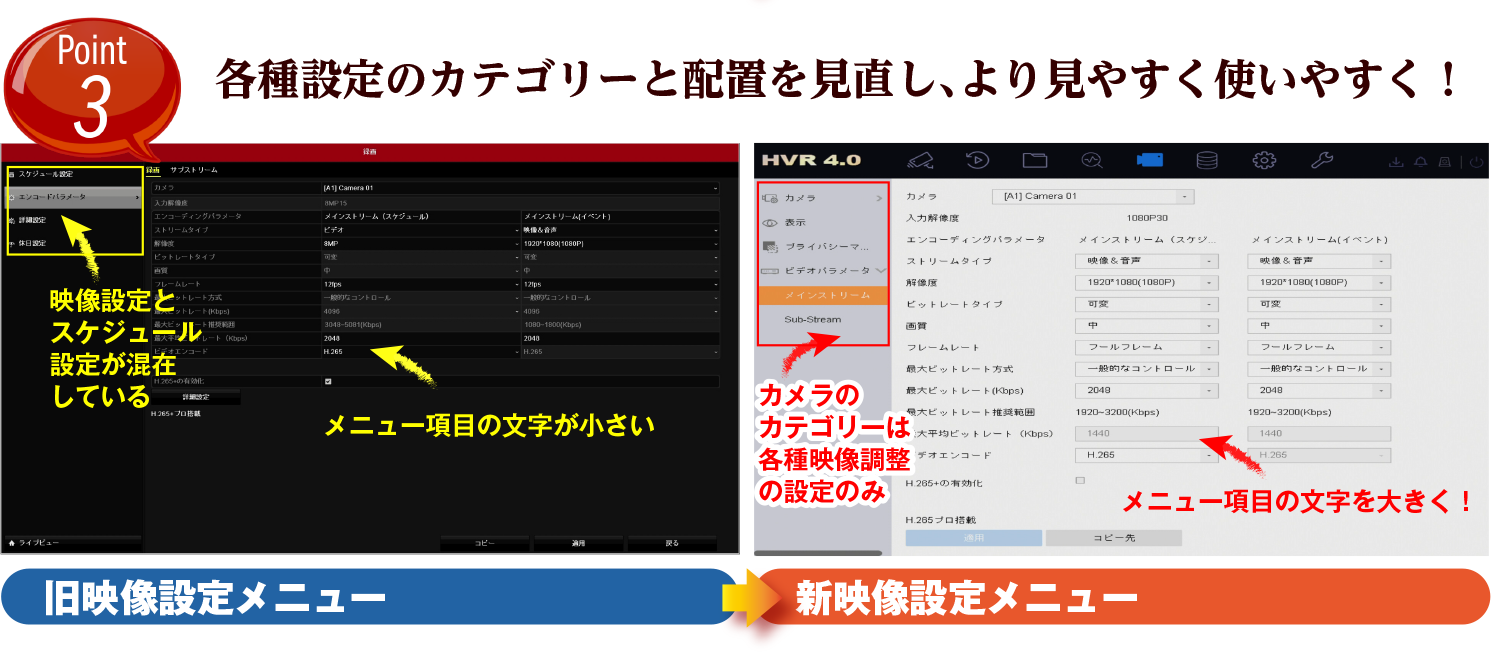 ※スポット(シーケンシャル)出力対応(指定したCHのみシーケンス表示可能)。メイン出力には対応していません。(映像調整機能のみ可能) ※CVBS出力で映像調整機能を使用する場合は、一度HDMI/VGAモニターを接続し、メニュー設定で切換操作が必要となります。また、CVBS出力で映像調整機能を使用している間は、HDMI/VGAモニターで録画装置の各種設定などは行えません。CVBS出力側で、メインモニターの切換操作が必要となります。 |