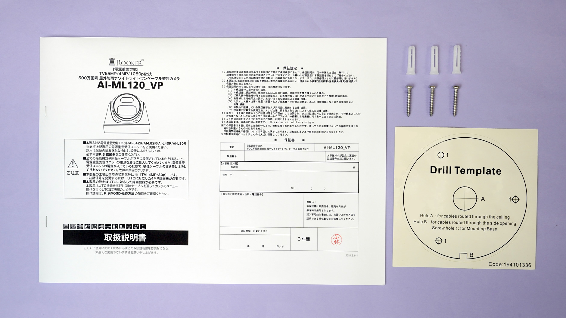 位置合わせシート,タッピングネジ×3,アンカープラグ×3,取扱説明書(保証書3年間)