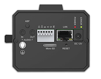 本体背面にはアラーム入出力、イーサネットポート(PoE)、電源入力(DC12V)、マイクロSDカードスロット、リセットボタン、音声入出力、電源や接続状況を確認するためのLEDランプ等の豊富なインターフェイスが装備されています。