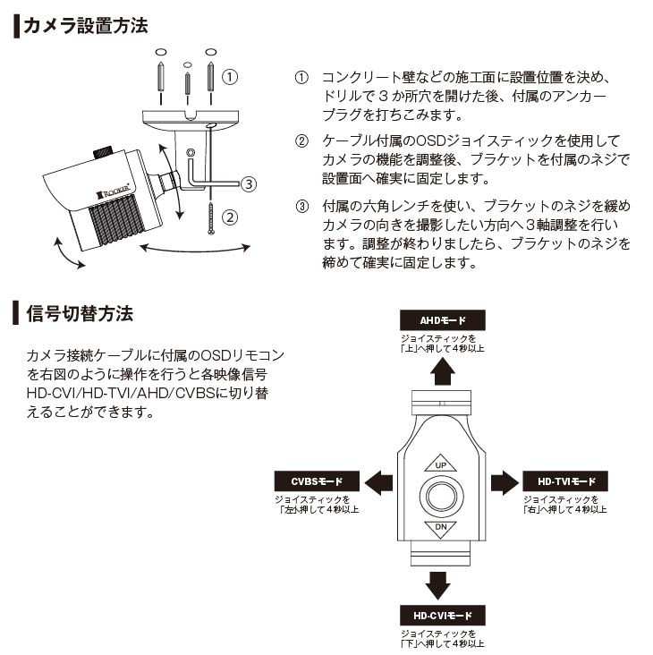 6つの映像信号規格に対応した、213万画素屋外防雨赤外線小型防犯カメラ。 | ||