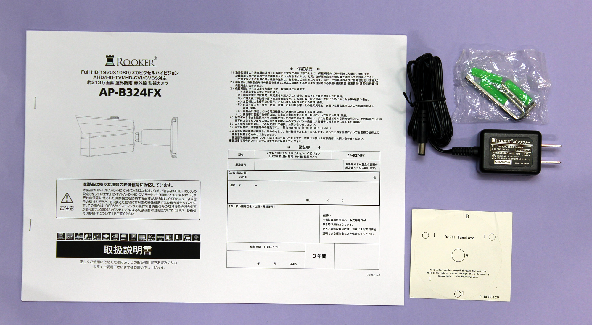 付属品 (1)ACアダプター(DC12V/1A) (2)プラスチックアンカー×3 (3)タッピングネジ×3 (4)六角レンチ×1 (5)位置合わせシート (6)取扱説明書、保証書3年間