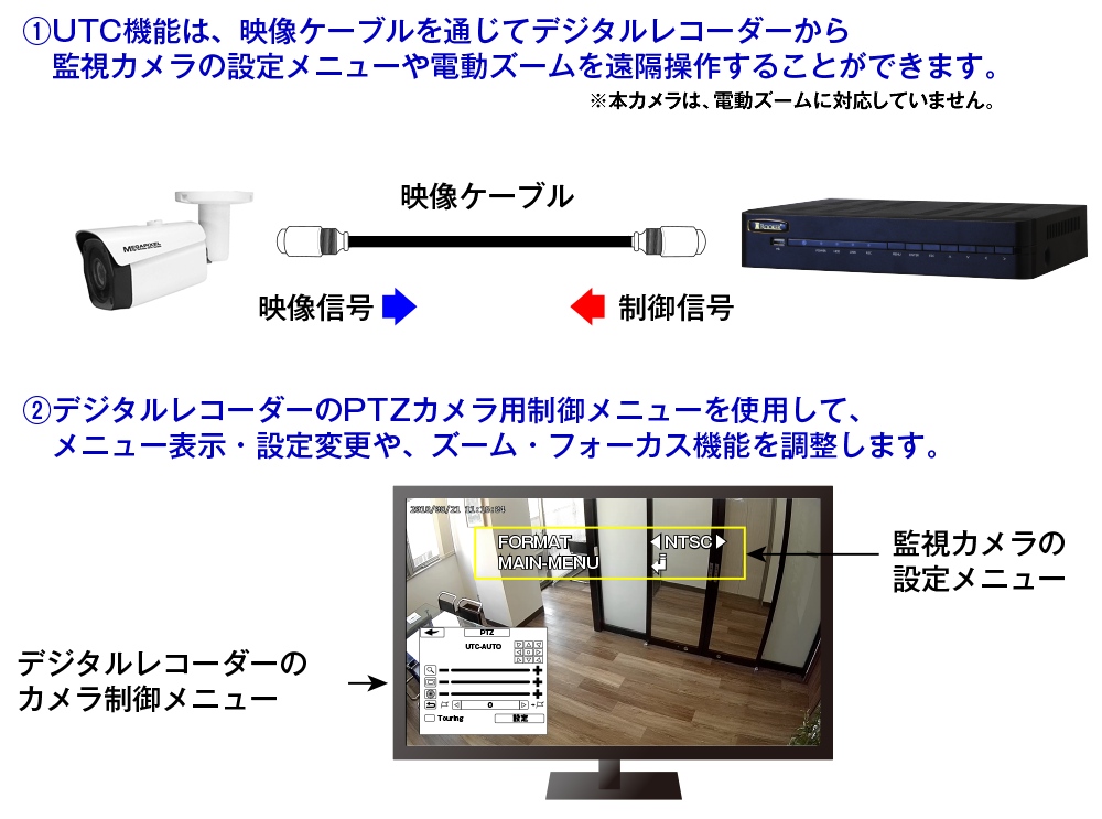 UTC(Up to Coax)機能とは、映像ケーブルにデータ通信を重畳し、デジタルレコーダーから監視カメラの設定メニューを遠隔操作することができる機能です。