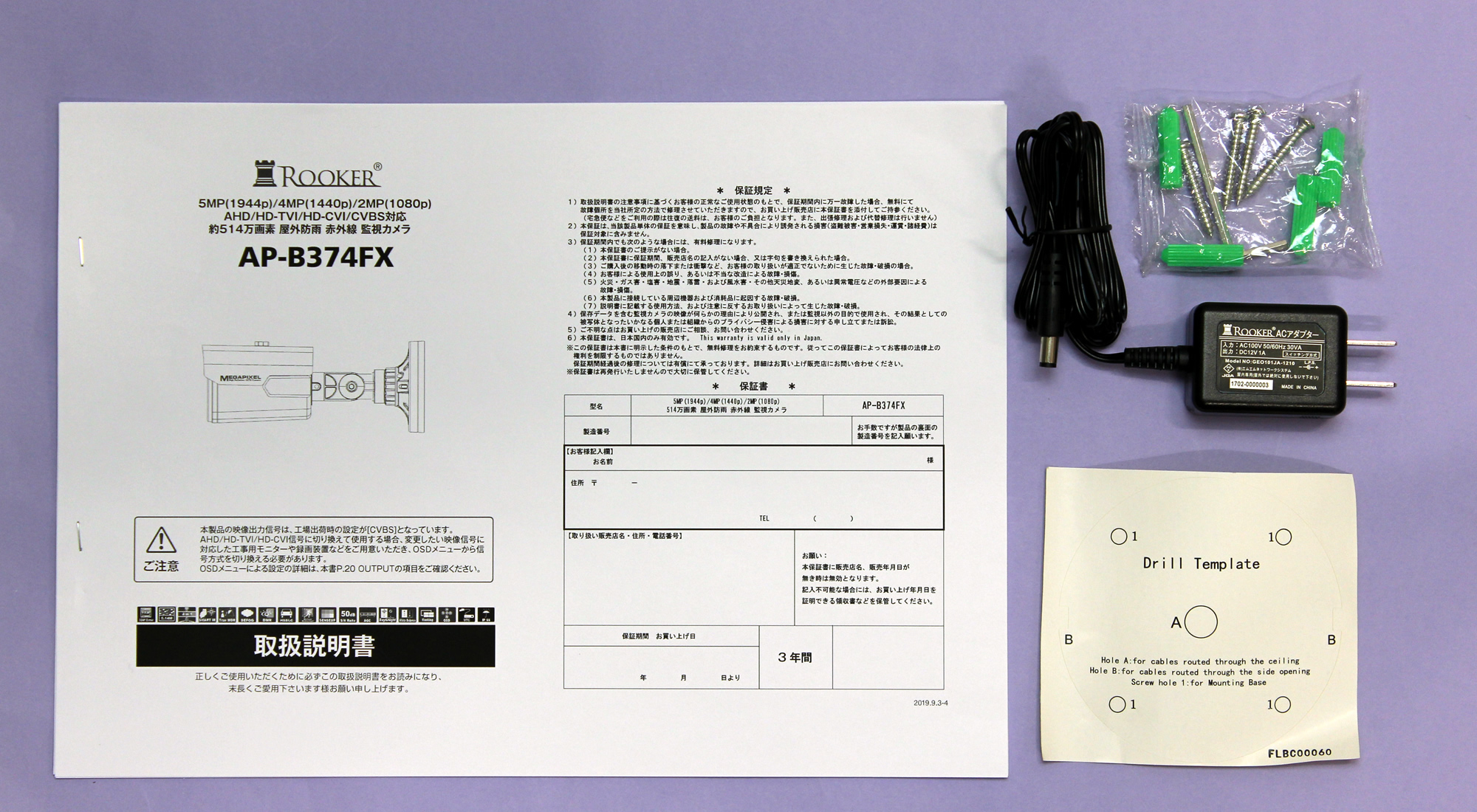 (1)ACアダプター(DC12V/1A) (2)プラスチックアンカー×4 (3)タッピングネジ×4 (4)六角レンチ×1 (5)位置合わせシート (6)取扱説明書、保証書3年間