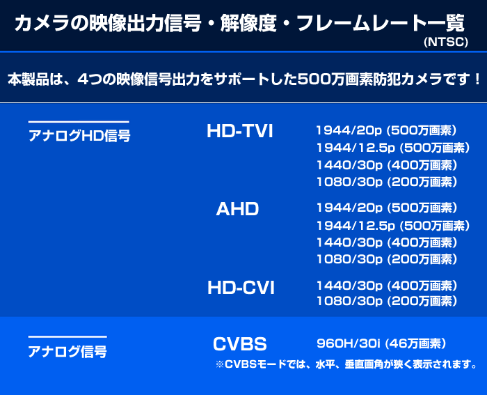 CVI 4MP:30fps/2MP:30fps), 960H(30i)CVBS ※工場出荷時設定はCVBS |