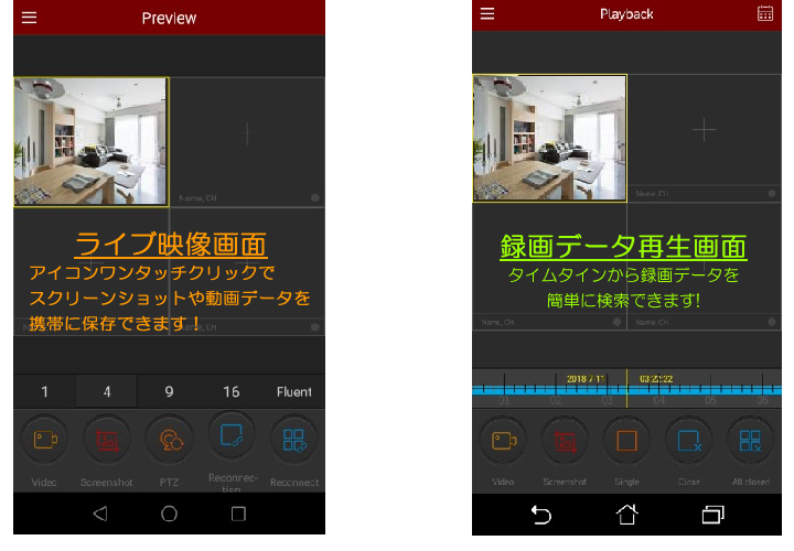 ネットワーク機能により、遠隔地からパソコンやスマートフォン(アンドロイド/iPhone(iOS) P2P対応)を利用して遠隔監視が可能です。 ※最新iOS11にも対応済み |