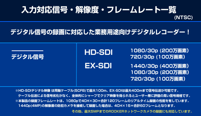 | CH構成 | EX-SDI/HD-SDIモード:4CH ハイブリッドモード:HD-SDI/EX-SDI(4CH)+専用IPカメラ(7CH) IPカメラモード:16CH | |