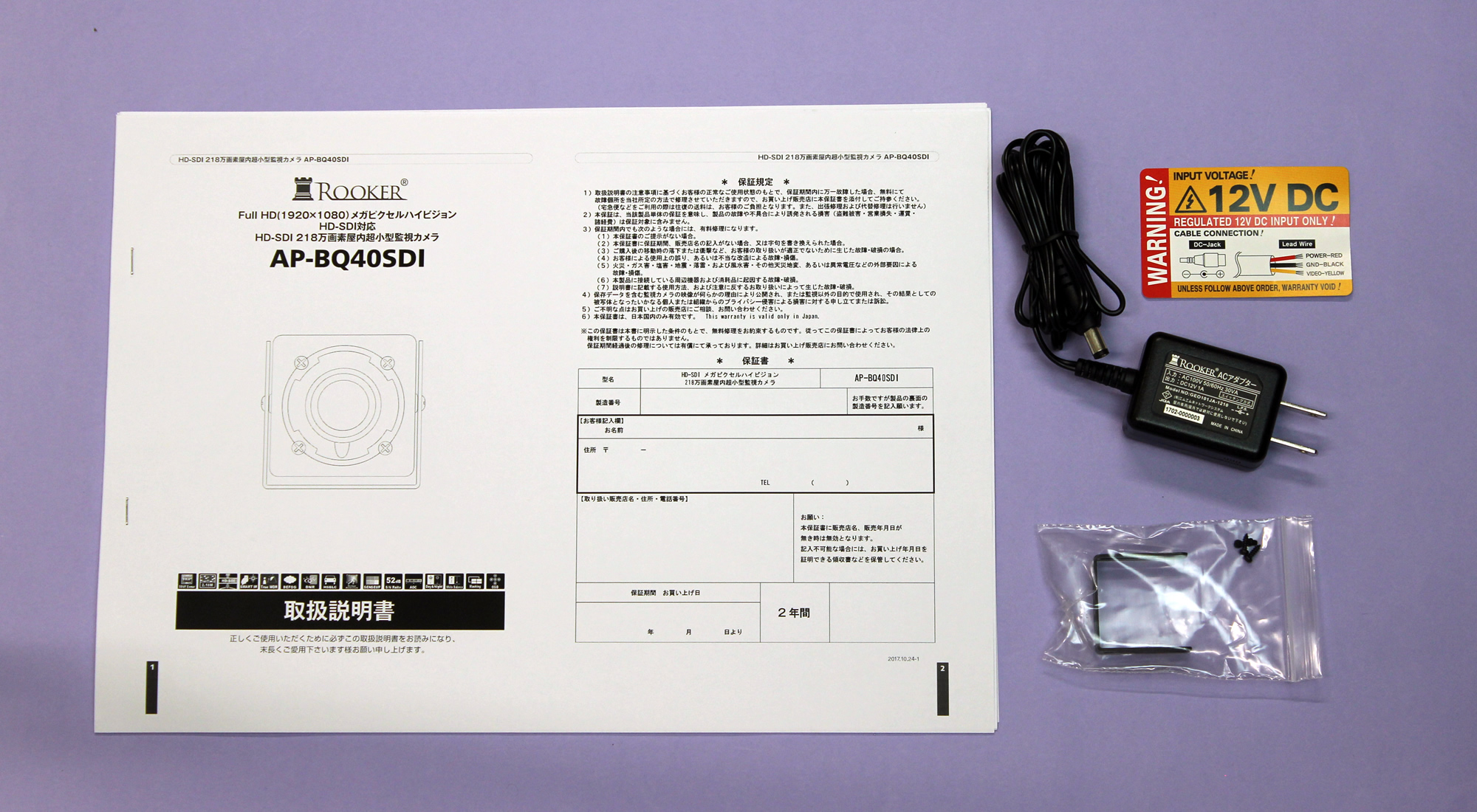 ブラケット、マシンねじ×2、タッピングねじ×2、ACアダプター(DC12V/1A)、取扱説明書、保証書2年間