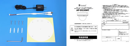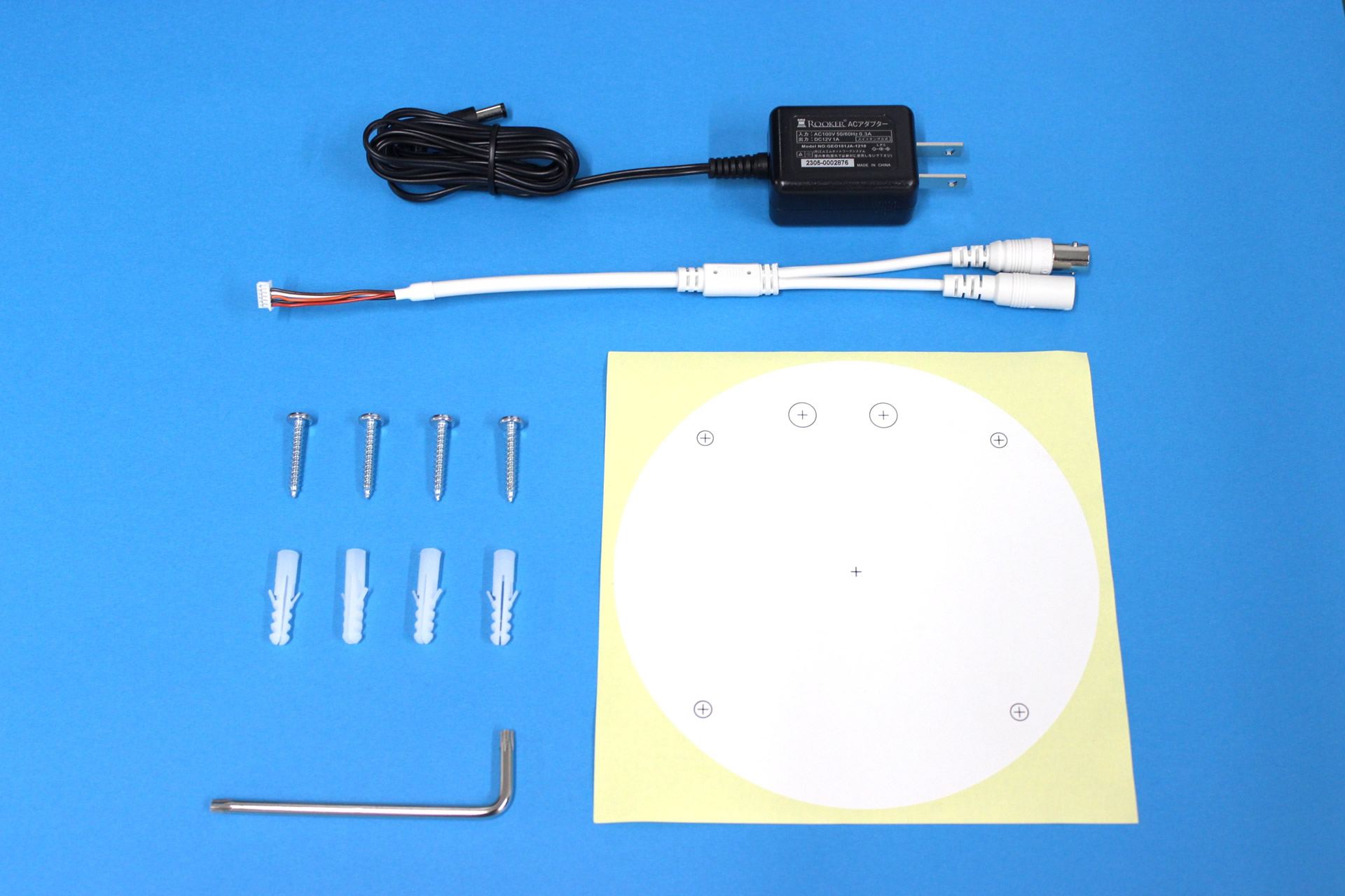 (1)ACアダプター(DC12V/1A) (2)プラスチックアンカー×4 (3)タッピングネジ×4 (4)専用レンチ×1 (5)位置合わせシート (6)モニターテスト用コード(CVBS) (7)取扱説明書、保証書2年間