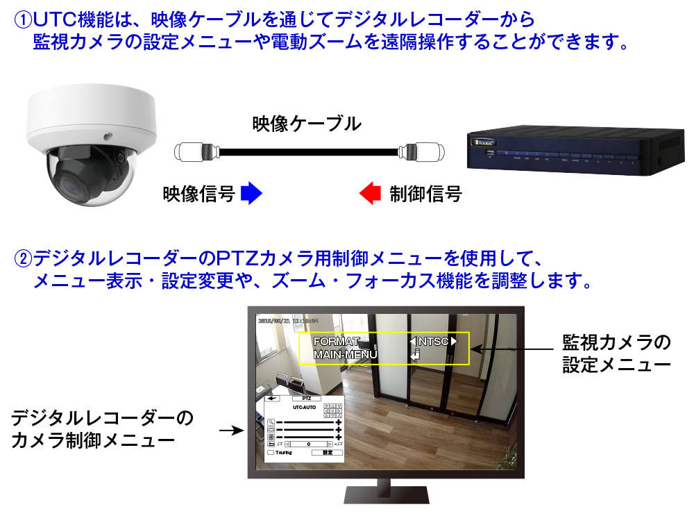 ●UTC機能の操作イメージ | UTC(Up to Coax)機能とは、映像ケーブルにデータ信号を重畳し通信するための技術で、UTCに対応したデジタルレコーダーから監視カメラの各機能や電動ズームレンズを遠隔で設定・操作することが可能です。 ※録画機器もUTC機能に対応している必要があります。