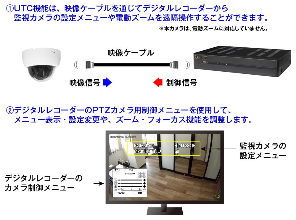 本カメラの設定や解像度変更は、UTC機能に対応したレコーダーやUTC対応分割器が必要です。 |