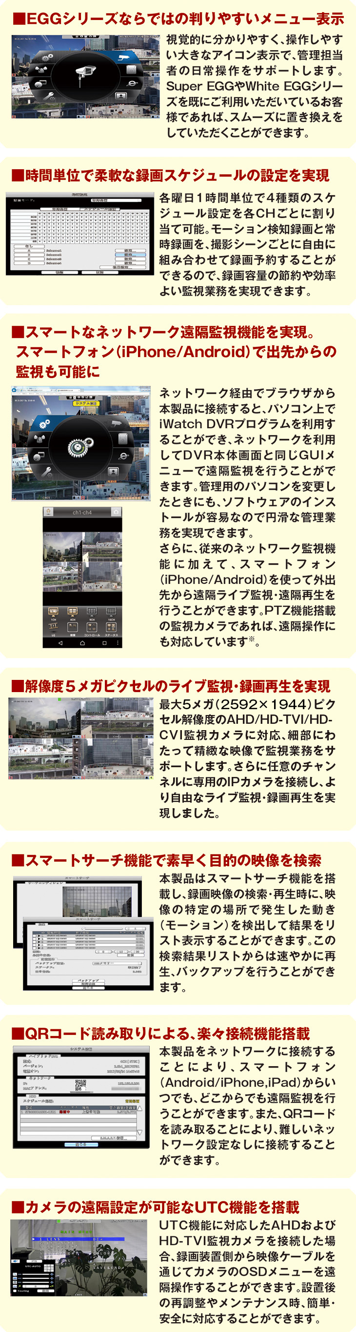 HD-TVI(5MP/4MP/1080p/720p)/AHD(5MP/4MP/1080p/720p)/CVBS(960H,D1)/IP(4MP/3MP/1080p/720p)カメラのマルチ監視/録画再生に対応!(4CH) | |
