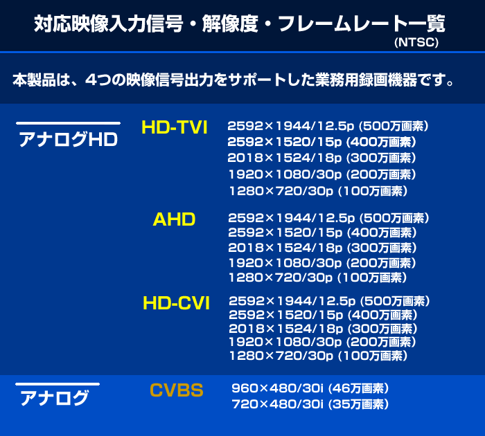 各監視カメラに10段階の画質と解像度の録画設定が可能。 [HD-TVI/AHD/HD-CVI] 2592x1944/120fps, 2592x1520/120fps, 2018x1524/120fps 1920x1080/240fps, 1280x720/240fps, [アナログ]960H/D1/240fp 専用IPカメラを接続しての同時録画を実現! | ||||||||||||||||