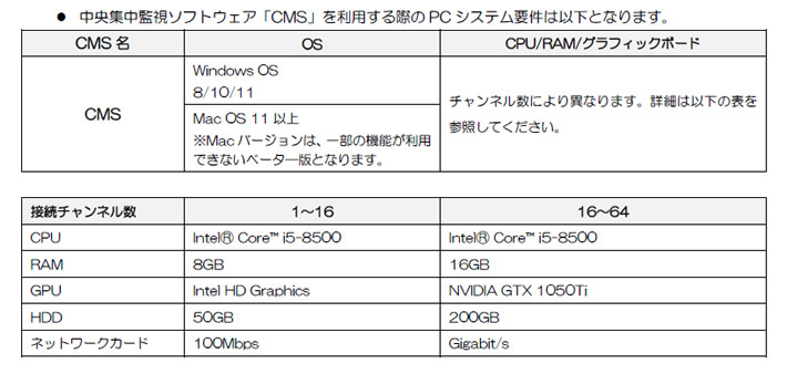 - 中央集中管理ソフト[CMS]は、無償でダウンロードが可能です。ダウンロード方法は取扱説明書をご覧ください。