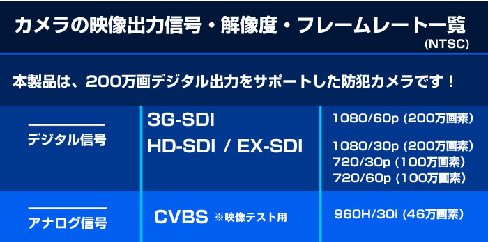 | S/N比 | 50dB以上(AGC OFF) | | 最低照度 | カラー:1.0 Lux/F1.2 白黒:0.5Lux/F1.2 0.01Lux/F1.2(電子感度アップ64倍時) | | 電子シャッター | 自動/手動(1/60~1/30,000秒) | | デジタル出力 | 解像度 | 1920×1080/60p(50p) 1920×1080/30p(25p),1280×720/60p(50p) |