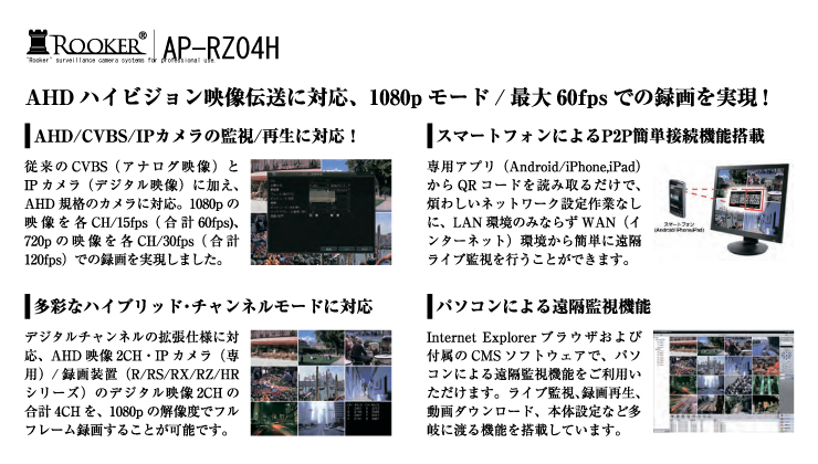 AHD(1080p/720p)/CVBS(960H,D1)/IP(720p)ネットワークカメラの録画に対応! AHD/CVBS信号方式の監視カメラを最大4台まで接続して録画管理することが可能です。 | |