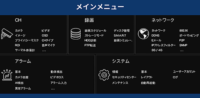 本製品の仕様やGUI(グラフィックユーザーインターフェイス)は、改良や機能追加、FW.アップデート等で変更になる場合があります。本DVRに搭載されている各AI機能の設定メニューは、本DVRに対応した専用のIPカメラと接続して利用可能な AI 管理機能が含まれます。