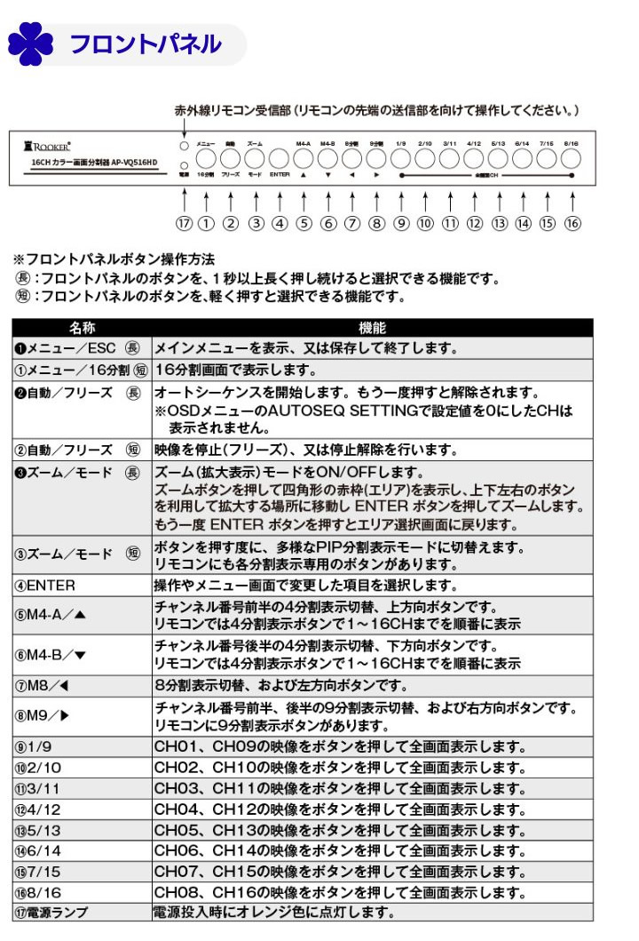 | 分割表示パターン | 1画面/2分割(左右/上下)/4分割/9分割/16分割/PIPモード |