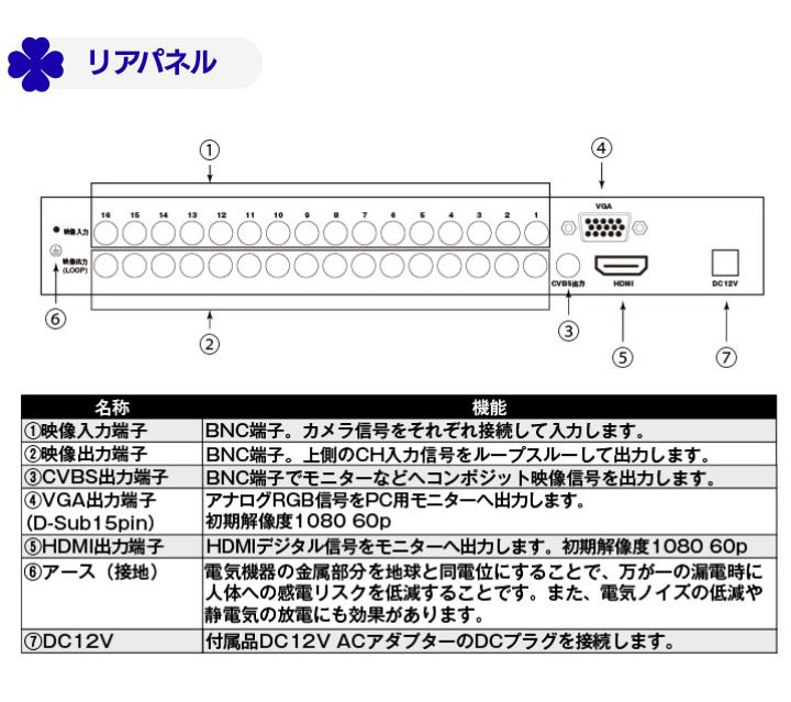 | ビデオロス検知 | ビデオロス検知時に内蔵ブザーを警鳴(自動) |