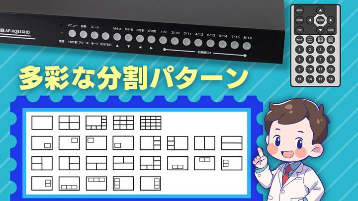 分割表示パターン | 1画面/2分割(左右/上下)/4分割/9分割/16分割/PIPモード |