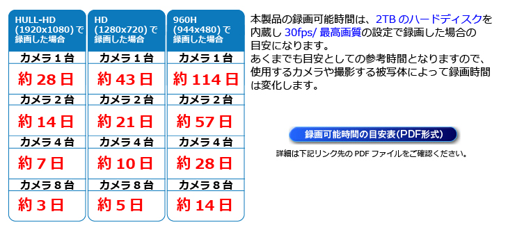 1920×1080/8CH合計240fpsのリアルタイム録画(動画)可能。 ※各CH最大30fps | ||