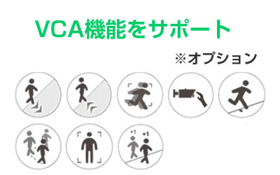 【VCA機能】 本ネットワークカメラは、8個のVCA(ビデオコンテンツ分析)機能をサポートしています。 ※別売オプション ※本体1台につき、VCAのライセンスが1つ必要となります。選択画面からVCAが付加された商品を選択してご注文下さい。 これらの分析機能は、ネットワークカメラの基幹ソフトウェアに完全に統合されており、高度なセキュリティシステムを実現することができます。 1.エリア侵入検知 2.エリア離脱検知 3.高度な動体検知 4.カメラの妨害検知 5.境界横断 6.徘徊検知 7.人物検知 8.人物カウント |