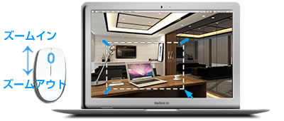 【マウスで簡単ズーム】 監視画面上でマウスを使用してズーム操作を行うことも可能です。 画面内の任意の位置を左クリックするとその位置が現在の監視映像の中心になるように移動します。 マウスの任意の位置を左クリックして矩形領域をドラッグすると自動的にズームイン、ズームアウトを実行します。 マウスホイールを上下に動かすとズームイン・ズームアウト操作することができます。 |