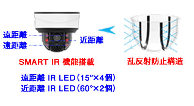 【スマートIR Ⅱ】 200万画素 PTZ ドーム型ネットワークカメラ(RK-260LSP)は、最大120mの強力な近赤外線IR LEDを6個搭載しています。IR LEDの明るさは、ズームの口径比に基づいて自動、手動で調整することが可能です。 スマート IR Ⅱ 技術は、IR LEDの照度調整が可能な技術です。近赤外線透過率と反射による悪影響を考慮し開発されたIR乱反射防止ドームカバーは、IR効果を最大限に高めることでより証拠能力の高い監視映像を提供します。 ※近赤外線 IR LED 照射距離:最大120m |