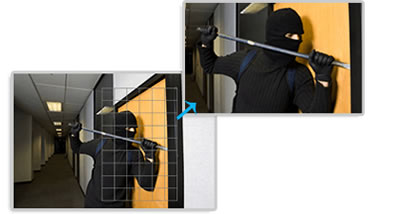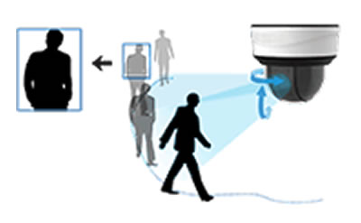【自動追尾機能】 自動追尾(オートトラッキング)機能を有効にすると、 パン・チルト機能を利用して動いている対象物を自動的に追尾することが可能です。 また光学ズーム機能を利用して対象物の距離に応じて自動的にズームステータスを調整します。 ターゲットは画面の中央に表示され、適切なサイズにズームアップされることで、スマートで信頼性の高いビデオ監視を提供します。 ※追跡中に監視エリア外に移動するなどで動く対象物を喪失した場合、あらかじめ設定した時間(秒)が経過すると元の監視ポジションに戻り、再び監視を継続します。 |