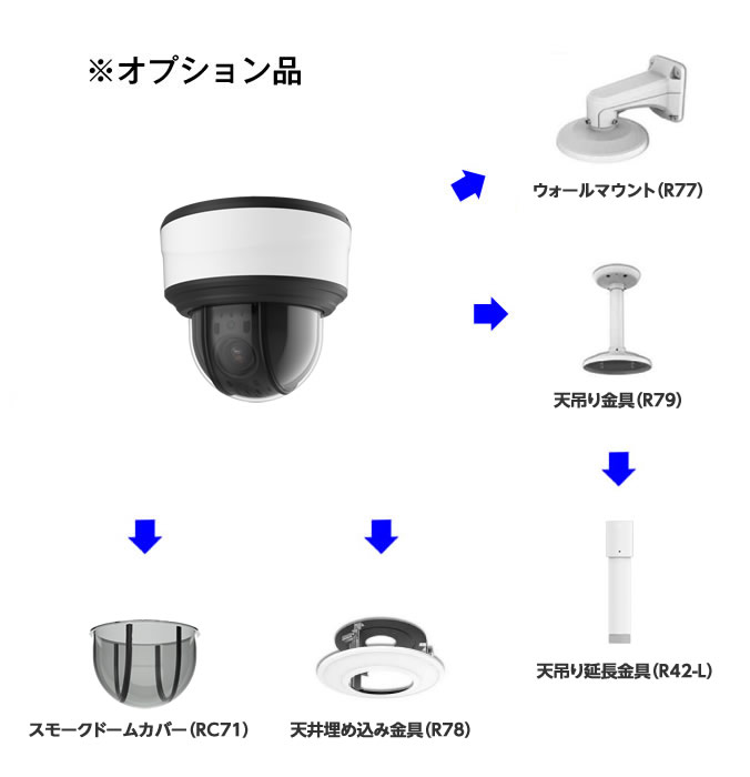 【多彩なオプション品】 別途オプションで、ウォールマウント(R77)、天井埋め込み金具(R78)、天吊り金具(R79)、天吊り延長金具(R42-L)、スモークドームカバー(RC71)が利用可能。 |