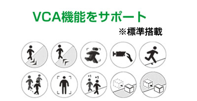 【VCA機能】 本ネットワークカメラは、10個のVCA(ビデオコンテンツ分析)機能を標準搭載しています。 これらの分析機能は、ネットワークカメラの基幹ソフトウェアに完全に統合されており、高度なセキュリティシステムを実現することができます。 1.エリア侵入検知 2.エリア離脱検知 3.高度な動体検知 4.カメラの妨害検知 5.境界横断 6.徘徊検知 7.人物検知 8.人物カウント 9.置き去り検知 10.持ち去り検知 |