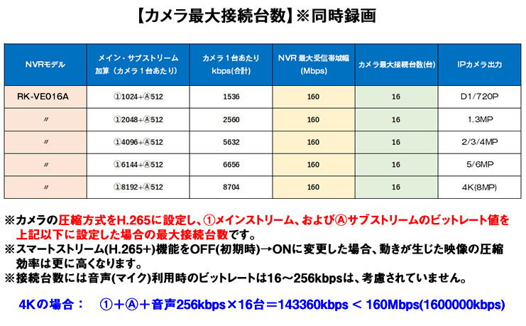 本NVRは、最大受信帯域幅160Mbpsに対応し、4Kカメラを最大16台まで同時録画が可能なハイエンドモデルです。