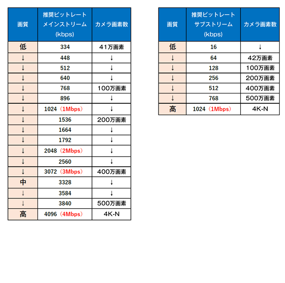 | 画素数別 標準ビットレートの目安 【H.265+ビデオ圧縮方式設定】 | |