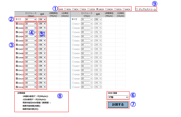 ② すべてのチャンネルに同じ設定を反映します。 ③ 利用しないチャンネルのチェックを外します。 ④ DVRに設定するメインとサブストリームのビットレート値を選択します。 ⑤ 音声を利用しない(マイク未搭載カメラも含む)チャンネルをOFFに設定します。 ⑥ DVRのHDD容量を選択します。 ⑦ ①~⑥までの項目を選択した後、「計算する」ボタンをクリックします。 ⑧ 計算結果を表示します。 ⑨ メインストリーム+サブストリームの両方を録画する場合に選択します。 注意:計算結果として表示される録画時間や録画日数は、H.265+圧縮方式で設定した場合の理論値となり 撮影環境によって異なる場合があります。 |
